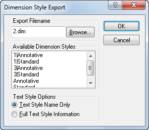 | Available Dimension Styles | Consente di selezionare gli stili di quota per la scrittura del file ASCII. Vengono visualizzati gli stili di quota correnti. Ciascuno stile selezionato viene scritto nel file specificato nel gruppo Export Filename. |