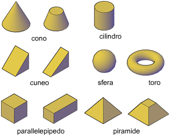 È possibile creare forme 3D di base, o solidi elementari, quali parallelepipedi, coni, cilindri, sfere, cunei, piramidi e tori (anelli).