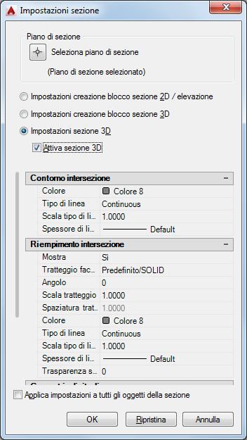 Quando è selezionata, applica tutte le impostazioni a tutti gli oggetti sezione nel disegno. Quando è deselezionata, applica le impostazioni solo all'oggetto sezione corrente.
