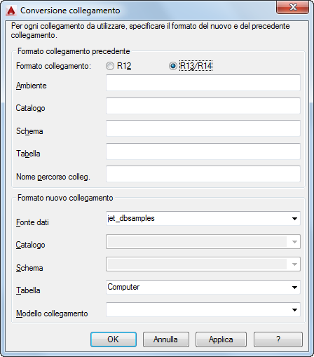 Poiché i collegamenti esistenti sono memorizzati in formati notevolmente diversi da quello di AutoCAD 2000 e versioni successive, il processo di conversione del collegamento richiede il mappaggio dei precedenti valori di collegamento ASE (AutoCAD SQL Extension ™ ) nei nuovi valori utilizzati da AutoCAD 2000 e versioni successive. Ad esempio, è necessario identificare l'ambiente utilizzato da un particolare collegamento nella release 14 e specificare la fonte dati corrispondente che si desidera sostituire a questo ambiente in AutoCAD 2000 e versioni successive. Mappaggi simili devono essere stabiliti tra tutti i precedenti valori di collegamento ASE e i nuovi valori da utilizzare.