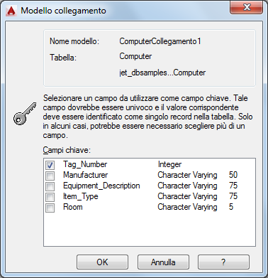 Visualizza tutti i campi disponibili per la tabella di database corrente, specificando anche il tipo e, nel caso dei campi per l'immissione di caratteri, la lunghezza del campo. Per specificare i campi chiave del modello di collegamento, selezionare la casella di controllo a sinistra del nome del campo dati.
