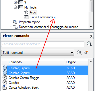 Nel riquadro Elenco comandi, trascinare il comando da aggiungere al sottomenu della barra degli strumenti nel riquadro Personalizzazioni in <nome file>.