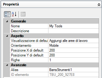 Nota: Le modifiche apportate in questa fase alle proprietà di una barra degli strumenti incidono esclusivamente sull'aspetto iniziale della barra degli strumenti dopo il caricamento del file di personalizzazione (CUIx). È preferibile utilizzare un'area di lavoro per controllare l'aspetto di una barra degli strumenti.