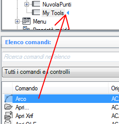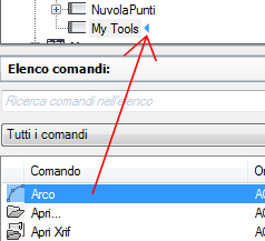 - Nel riquadro Elenco comandi, trascinare il comando da aggiungere alla barra degli strumenti nel riquadro Personalizzazioni in <nome file>.