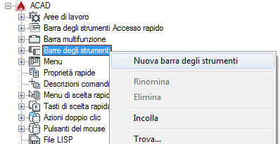 - Nella scheda Personalizza, nel riquadro Personalizzazioni in <nome file>, fare clic con il pulsante destro del mouse sul nodo Barre degli strumenti e scegliere Nuova barra degli strumenti.