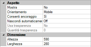Nota: Per specificare che una finestra deve essere ancorata, impostare Orientamento su Sinistra, Destra, Alto o Basso e Nascondi automaticamente su On.