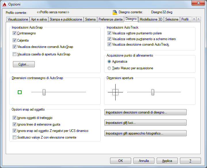 Imposta le opzioni per diverse funzioni di modifica, tra cui AutoSnap e AutoTrack.
