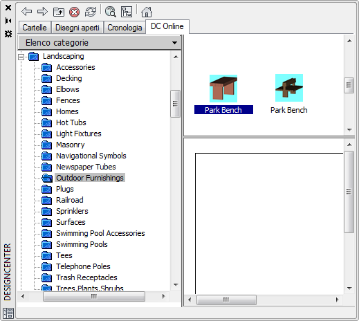 Per accedere a DesignCenter Online, fare clic sulla scheda DC Online in DesignCenter. Una volta aperta la finestra di DesignCenter Online, sarà possibile sfogliare, cercare e scaricare contenuti da utilizzare nei disegni.