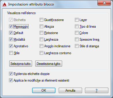 Attiva/disattiva l'evidenziazione delle etichette doppie. Se l'opzione viene selezionata, le etichette di attributo duplicate vengono visualizzate in rosso nell'elenco degli attributi. Se è deselezionata, le etichette doppie non vengono evidenziate.