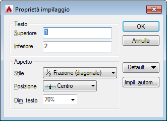 Consente di specificare un formato di stile per il testo impilato: frazione orizzontale, frazione diagonale, tolleranza e decimale.