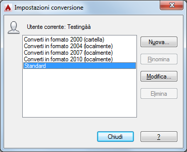 Visualizza un elenco delle impostazioni di conversione salvate in precedenza e l'impostazione di default; Standard.