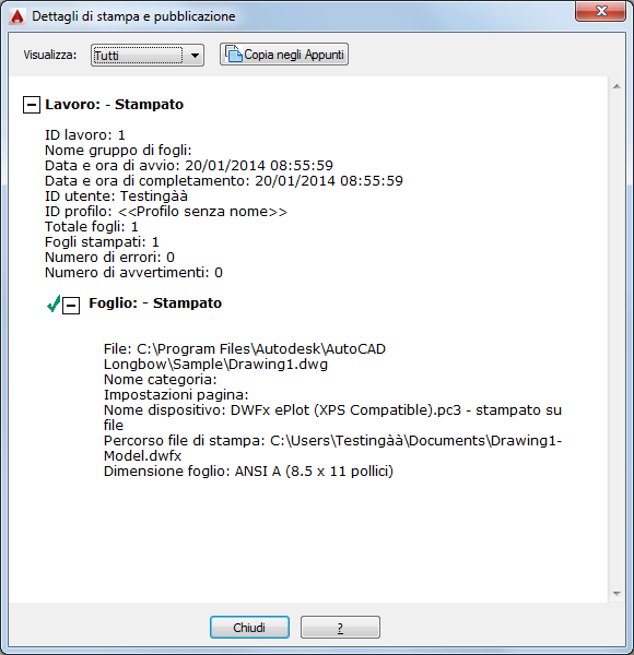 Visualizza informazioni sulla stampa e la pubblicazione dei lavori completati nella sessione corrente.