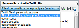 Tutti i nuovi comandi creati vengono aggiunti direttamente al file CUIx di lavoro. Se il file CUIx che si desidera utilizzare non è caricato, selezionare Apri dall'elenco a discesa dei file di personalizzazione. Quindi scorrere l'elenco e selezionare il file CUIx desiderato.