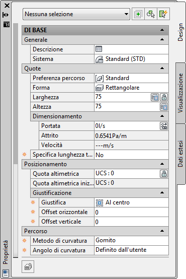Il riquadro proprietà mostra un valore accanto al campo Velocità, ad indicare che la dimensione del canale aria è stata calcolata utilizzando il metodo di velocità costante.