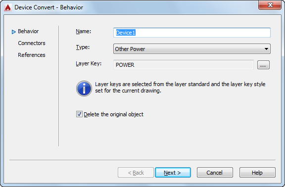 È possibile convertire singoli blocchi AutoCAD, blocchi multivista o parti multivista in dispositivi. Poiché i dispositivi sono oggetti basati su stili e tutti gli oggetti basati su stili sono definiti da stili, viene creato anche uno stile di dispositivo associato.