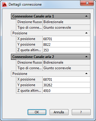 Nel foglio di lavoro Dettagli connessione vengono visualizzate le proprietà riportate di seguito, a seconda del tipo di oggetto selezionato. Per queste proprietà è possibile modificare solo le coordinate di posizione e quota altimetrica.