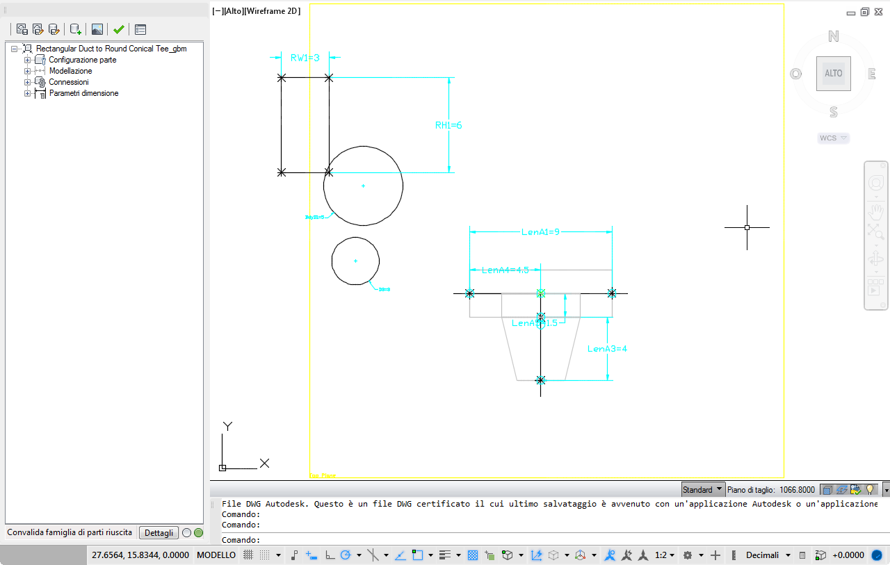 Quando si sceglie di creare o modificare una parte parametrica, nel Generatore di contenuti viene utilizzato l'ambiente di costruzione parametrico. Nel seguente esempio il Generatore di contenuti visualizza un T ad innesto conico per canale aria da rettangolare a circolare. Per ulteriori informazioni, vedere Avvio del Generatore di contenuti.