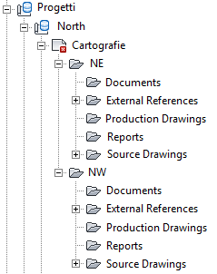 Come illustrato nella figura 2, i progetti NE e NW si trovano all'interno di un unico progetto Vault denominato North. I riferimenti di Vault possono essere collegati a qualsiasi oggetto presente all'interno della cartella del progetto North. Se si desidera estendere questi riferimenti ad altri progetti, creare nuove cartelle per tali progetti all'interno della cartella di lavoro del progetto North. Replicare la struttura del progetto in Vault, utilizzando lo strumento di amministrazione Autodesk Vault. Le sottocartelle possono essere utilizzate per organizzare le cartelle per Carte e documenti, ma non per altri oggetti di progetto, quali i collegamenti ai riferimenti nella scheda Prospetto o i file di database di Vault (PointsStatus.mdb, PointsGeometry.mdb, Survey.sdb e Survey.sdx).