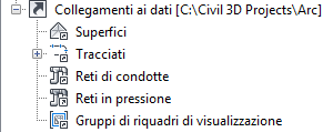 È possibile creare collegamenti ai dati solo per superfici, tracciati, profili, reti di condotte, reti in pressione e gruppi di riquadri di visualizzazione. Forniscono collegamenti di riferimento tra Carte senza dover utilizzare un database. Quando si creano dei collegamenti ai dati da una Carta, vengono visualizzati nel nodo Collegamenti ai dati della struttura prospetto. Da questa posizione è possibile inserire un oggetto di riferimento in un'altra Carta aperta facendo clic col pulsante destro del mouse sul suo collegamento.