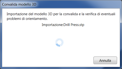 - Viene visualizzata la finestra di dialogo Convalida modello 3D, che riporta il seguente messaggio durante l'importazione del modello 3D all'interno del layout.