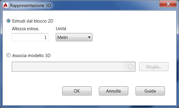 Questa è l'opzione di default. Con questo metodo è possibile inserire un valore di estrusione nella casella di testo Altezza di estrusione e scegliere il sistema di misura desiderato dal menu a discesa Unità. È opportuno tenere presente che il valore di estrusione immesso viene applicato all'intero blocco.