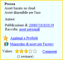 Gli utenti possono scegliere di condividere gli asset basati su cloud con altri utenti al momento della pubblicazione. Quando un asset è condivisibile, gli altri utenti possono classificarlo o commentarlo. Le classificazioni e i commenti relativi agli asset sono visibili sia dal Browser asset che dalla pagina Informazioni asset del Magazzino asset di Factory basato sul Web.