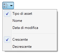 È possibile accelerare la ricerca di un asset ordinando gli asset per tipo, nome o data di modifica. È inoltre possibile scegliere di visualizzare gli asset così organizzati in ordine crescente (impostazione di default) o decrescente. Il metodo di ordinamento scelto è persistente, ovvero rimane attivo per le successive sessioni di Inventor Factory. Fare clic sulla freccia verso il basso sull'icona