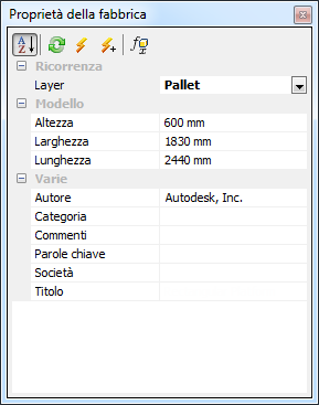 Una volta posizionato un asset dal Browser asset, è possibile selezionarlo e modificare i parametri Modello o i parametri Varie disponibili nel browser Proprietà della fabbrica. Il browser Proprietà della fabbrica viene visualizzato automaticamente quando viene creato un nuovo layout. Per attivare/disattivare il browser Proprietà della fabbrica, fare clic su