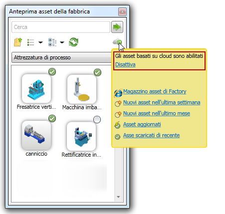 Disattiva dalla finestra informazioni a comparsa relativa agli asset basati su cloud. Si noti che in questa finestra di dialogo vengono visualizzate anche informazioni sullo stato degli asset basati su cloud e consente di accedere al