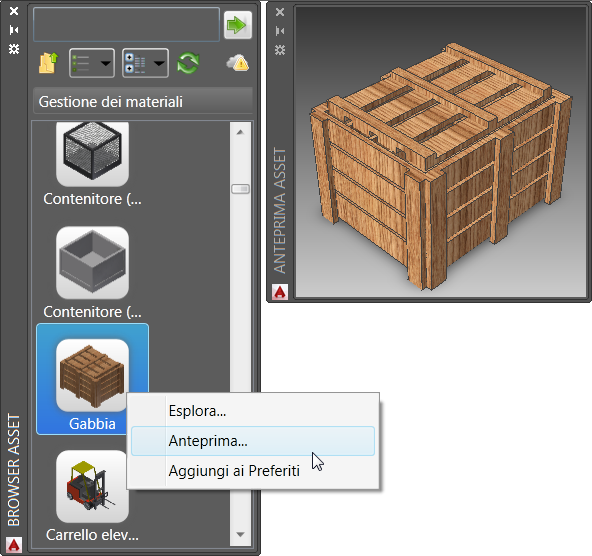 Nota: Si consiglia di creare gli asset 3D in Inventor Factory. Il processo di creazione e pubblicazione include un'opzione di pubblicazione dell'asset 2D che consente di creare e associare l'asset 2D con l'asset 3D corrispondente. Una volta pubblicato utilizzando questa opzione, l'asset 2D viene visualizzato nel Browser asset di AutoCAD Factory ed è disponibile per il posizionamento.