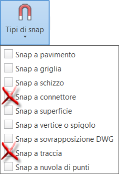 - Iniziare attivando le opzioni Snap a Snap a vertice o bordo e Snap a traccia dal menu a discesa Tipi di snap nel gruppo Opzioni. Disattivare le altre opzioni Snap a nel menu.