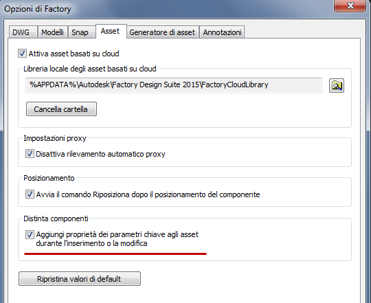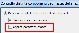 Selezionare la casella di controllo sotto Distinta componenti per visualizzare i parametri chiave dell'asset dopo che la distinta componenti è stata generata. Se non si seleziona la casella di controllo sotto Opzioni di Factory, è inoltre possibile scegliere di aggiungere parametri chiave in Controllo distinta componenti.
