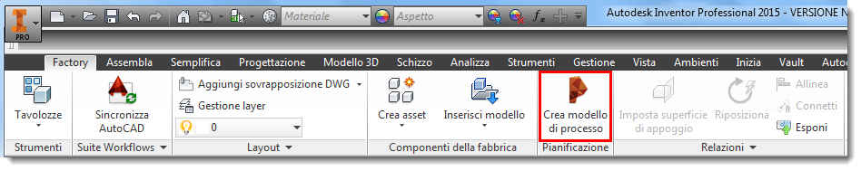 È possibile avviare Process Analysis 360 selezionando il pulsante Crea modello di processo nella barra degli strumenti di Inventor Factory.