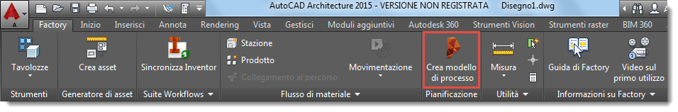 In AutoCAD Factory, avviare Process Analysis 360 selezionando il pulsante Crea modello di processo situato nella barra degli strumenti.