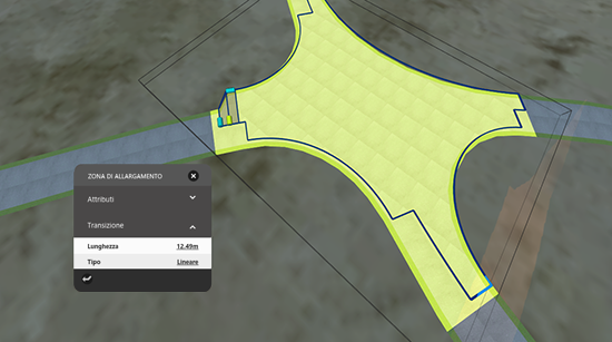 - Fare clic e trascinare i manipolatori per creare corsie di svolta o zone di allargamento della dimensione e della forma desiderate e per regolare le posizioni di inizio e fine transizione.