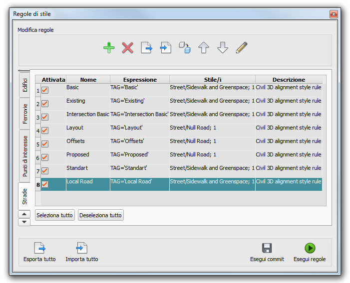 Nell'illustrazione seguente sono riportate 8 regole di stile di default per le strade che sono state caricate (tramite il comando Importa tutto). Utilizzare il tasto TAB per visualizzare le 20 regole di stile di default per le aree di copertura.
