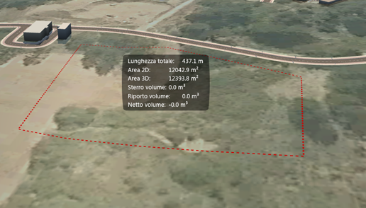 - Se si modifica la quota altimetrica dell'area misurata, in Area/Volume terreno viene visualizzato il volume dell'area prima e dopo la modifica.