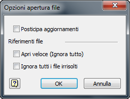La nuova opzione Apri veloce nella finestra di dialogo Opzioni apertura file del disegno apre un disegno rapidamente. Quando si seleziona Apri veloce, non viene eseguito alcun tentativo di ricerca o risoluzione di eventuali file cui fa riferimento il disegno. Una volta aperto, il disegno si comporta come se fosse stato aperto senza la presenza di riferimenti a file. È possibile apportare modifiche e salvarle.
