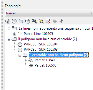 Nella finestra di dialogo Controllo topologia dell'area vengono elencati tutti gli errori di topologia in Esplora entità geografiche.