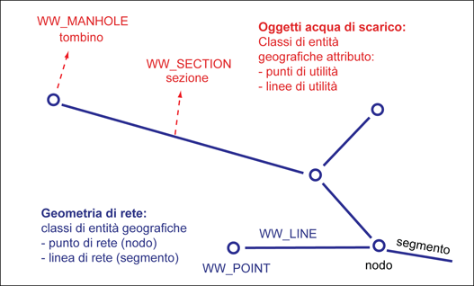 Il modulo Acque di scarico è basato sul modello di dati di impianto, in cui i dati su geometria e attributi vengono memorizzati separatamente. Il modello di dati include argomenti, rappresentazioni, domini, impianti, topologie e intersezioni.