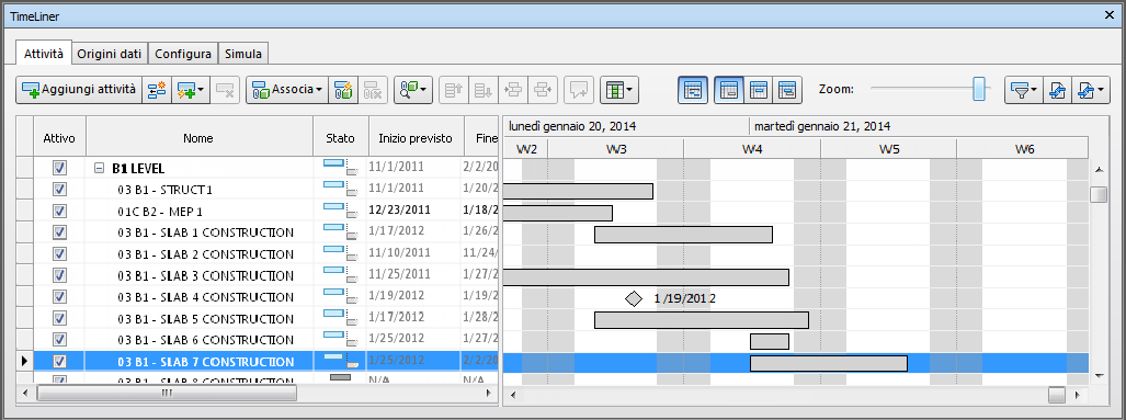 Autodesk Navisworks TimeLiner supporta una struttura gerarchica delle attività importata da un'origine dati, ad esempio Microsoft Project™. Per maggiori informazioni vedere Scheda Origini dati. È possibile espandere o comprimere la gerarchia facendo clic rispettivamente sul segno più o meno a sinistra dell'attività.