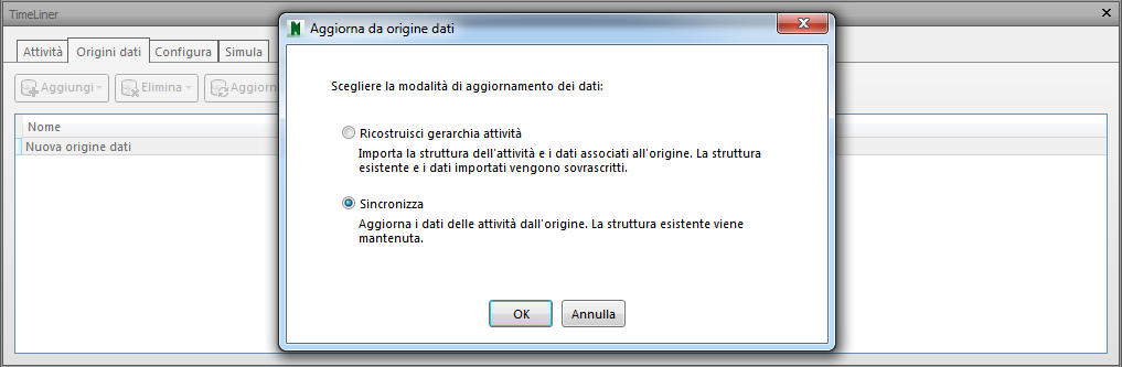 Utilizzare la Scheda Origini dati per importare attività da un'origine esterna, ad esempio Microsoft Project™. Scegliere un campo della pianificazione esterna per definire i tipi di attività importate, oppure definirli manualmente. È possibile modificare i parametri di attività direttamente in TimeLiner. È possibile inoltre aggiornare la pianificazione esternamente ed eseguire l'aggiornamento delle attività di TimeLiner per allinearle con quelle dell'origine esterna. Qualsiasi modifica apportata ad attività importate dai file di progetto esterni verrà sovrascritta al successivo aggiornamento dell'origine dati corrispondente.