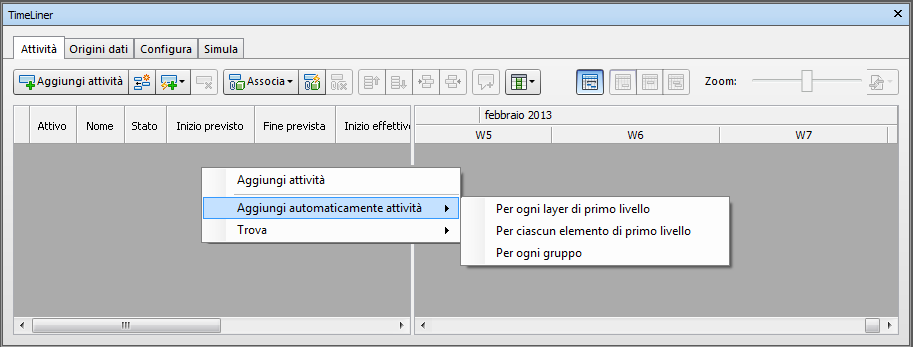 nella scheda Attività o fare clic col pulsante destro del mouse nell'area delle attività e creare un gruppo iniziale di attività basate sui nomi di layer, elementi o gruppi di selezione. TimeLiner include alcuni tipi di attività di default (Costruzione, Demolizione e Temporaneo), ma è anche possibile personalizzarne altri nella Scheda Configura. È inoltre possibile visualizzare una rappresentazione grafica di sola lettura della pianificazione del progetto e passare tra grafici di Gantt relativi alle date seguenti: Prevista, Effettiva e Prevista rispetto ad Effettiva.