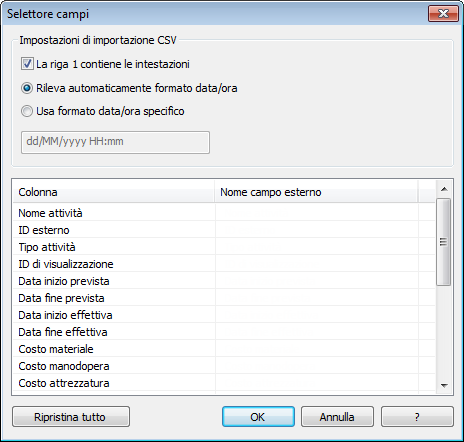 La finestra di dialogo Selettore campi per l'importazione di dati da un software di pianificazione esterno