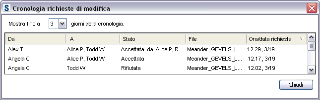 Nella finestra di dialogo Cronologia richieste di modifica possono essere visualizzate informazioni sulle richieste di modifica effettuate negli ultimi cinque giorni.