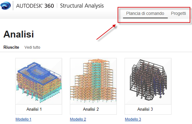 Per default, il sito Web Autodesk® 360 Structural Analysis viene aperto sulla scheda Plancia di comando. In questa scheda è possibile visualizzare tutte le analisi eseguite recentemente (completate, in corso e non riuscite).