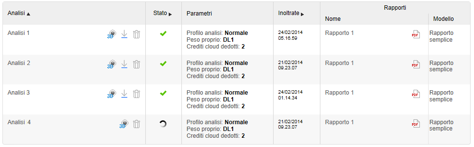 - Individuare la riga contenente l'analisi selezionata, quindi fare clic sul collegamento del rapporto (per un formato HTML) o sull'icona del formato PDF.