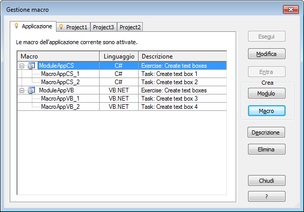 È possibile aggiungere, modificare, creare ed eliminare moduli e macro utilizzando queste schede.