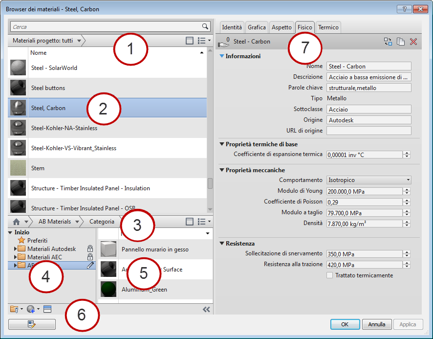 7 Se si seleziona un materiale nell'elenco delle librerie (riquadro a sinistra), il riquadro a destra mostra le schede associate a tale materiale. Fare clic sulle schede (ad esempio Identità o Aspetto) per visualizzare le proprietà del materiale. Durante la visualizzazione di materiali nelle librerie, le proprietà sono di sola lettura.