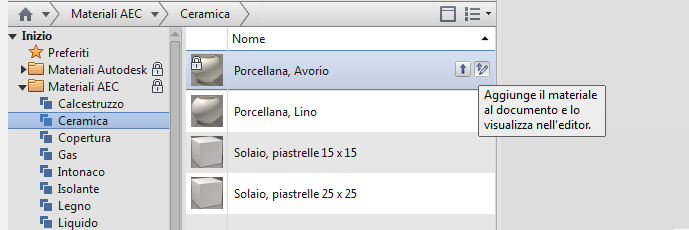 • Nell'elenco dei materiali della libreria, fare clic su un materiale, quindi fare clic sul pulsante Aggiungi/Modifica , che consente di aggiungere il materiale all'elenco dei materiali del progetto.
